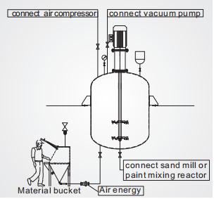 Open the discharge pneumatic valve of weighing tank and feeding pneumatic valve of production tank , open the vacuum valve at the same time, and inhale the already weighed emulsion into the production tank by vacuum.